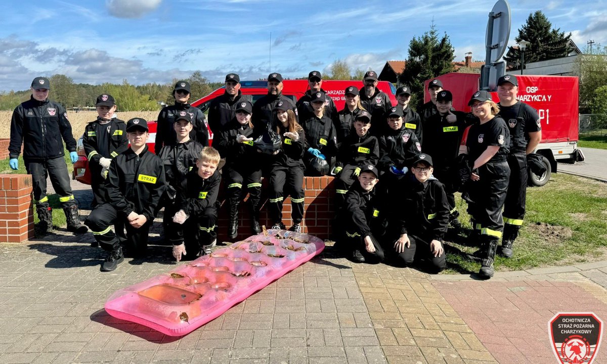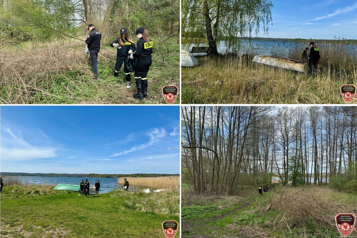 Strażacy i młodzież z OSP Charzykowy wzięli udział w sprzątaniu brzegu jeziora Charzykowskiego. | fot. OSP Charzykowy
