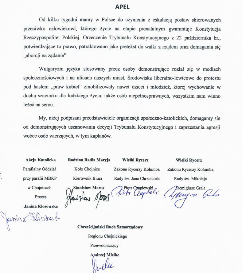 W związku z powyższym 11 listopada chojnickie środowiska chrześcijańskie opublikowały list otwarty, w którym piszą m.in. „Od kilku tygodni mamy w Polsce do czynienia z eskalacją postaw skierowanych przeciwko człowiekowi, którego życie na etapie prenatalnym gwarantuje Konstytucja Rzeczypospolitej Polskiej. Orzeczenie Trybunału Konstytucyjnego z 22 października br. potraktowano jako pretekst do walki z rządem oraz domagania się „aborcji na żądanie”.