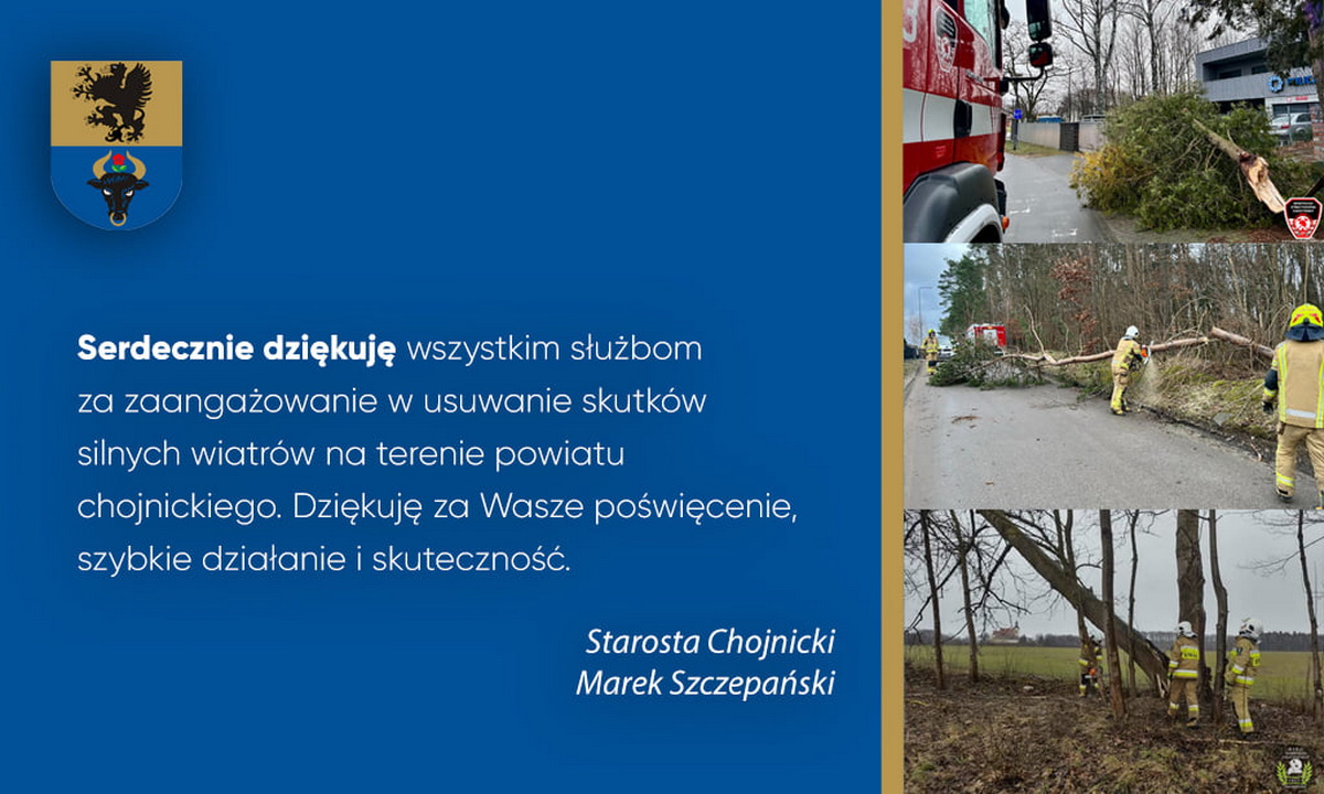 Starosta Chojnicki Marek Szczepański serdecznie dziękuje wszystkim służbom, pogotowiom energetycznym, policji, straży pożarnej... wszystkim, którzy z zaangażowaniem i poświęceniem brali udział w walce ze skutkami wichury.