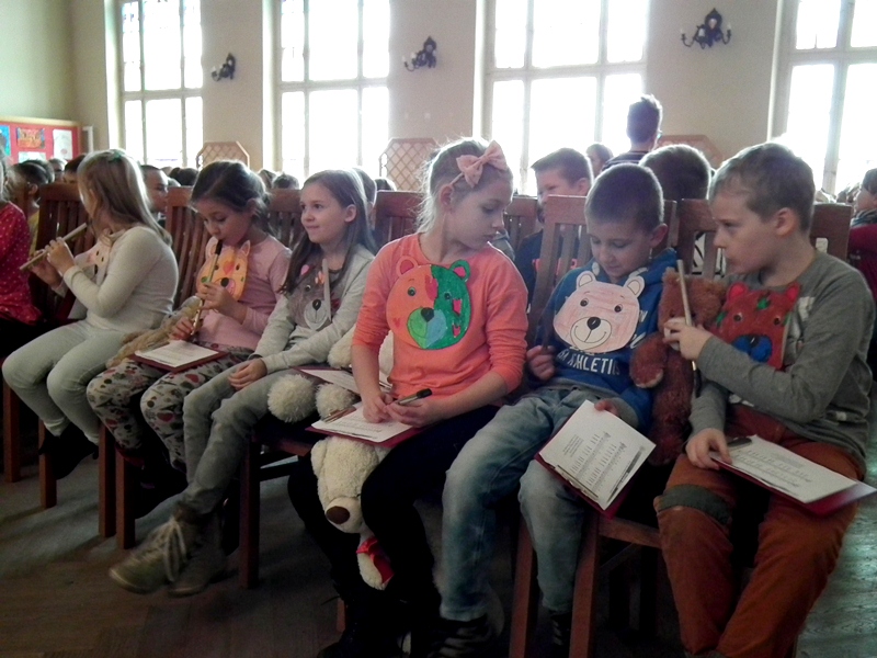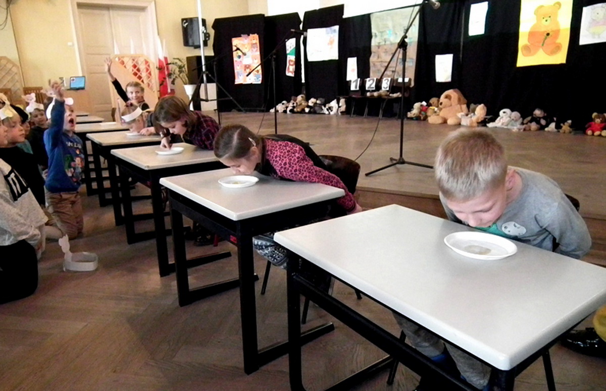 Jednak najwięcej emocji dostarczyły dzieciom „misiowe konkurencje”, czyli zjadanie miodu z talerzyka, przenoszenie patyczków w kuchennej rękawiczce, która symbolizowała misiową łapę, rysowanie misia z zawiązanymi oczami itp. Wszyscy uczestnicy otrzymali „małe co nieco” w postaci słodkości.