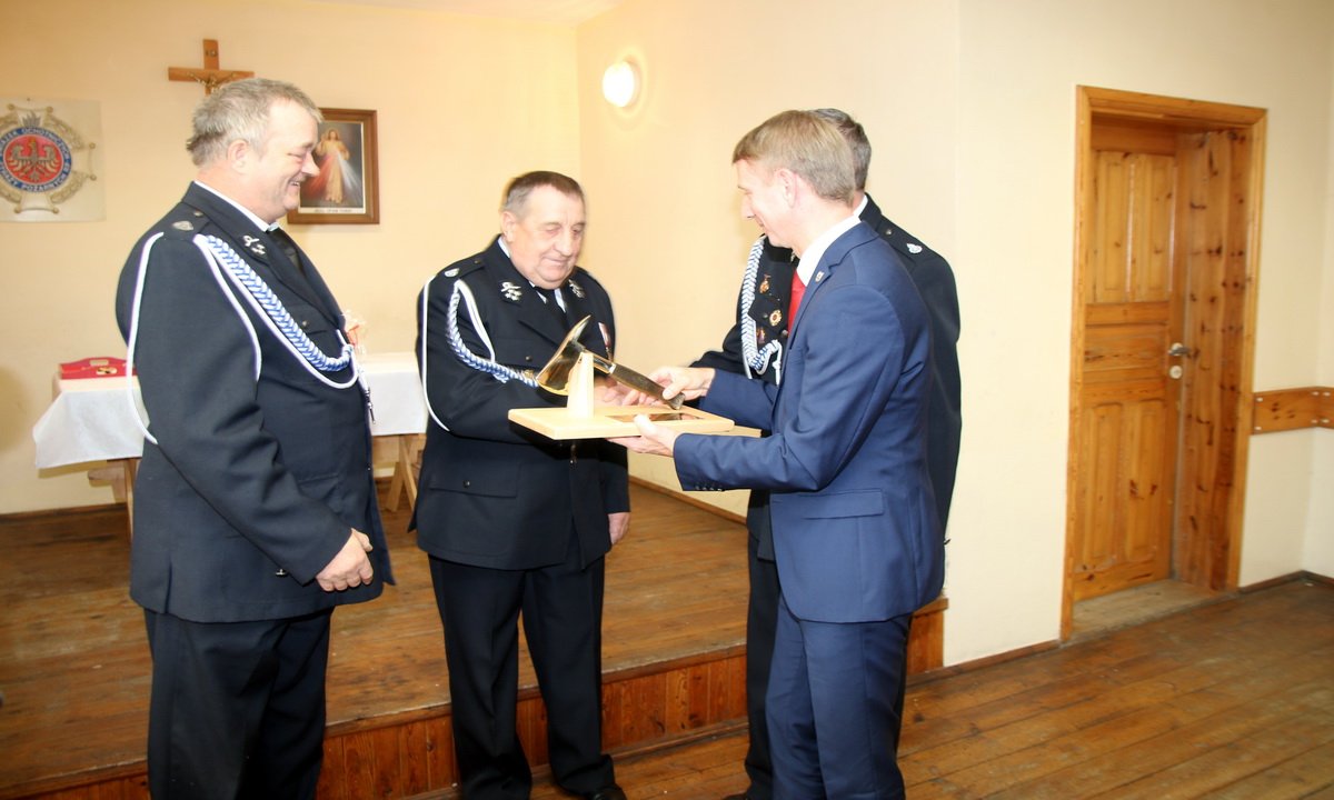 Burmistrz Brus Witold Ossowski wręcza jubileuszowy toporek na ręce Prezesa OSP w Czarniżu Józefa Gierszewskiego. | fot. nad.