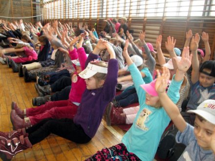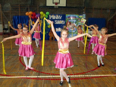 Nie zabrakło też zabaw i pląsów przygotowanych dla całej uczniowskiej widowni. Prowadził je pan Andrzej Schulz. Sala gimnastyczna była miejscem radosnej, wesołej zabawy! Najmłodsi z oddziałów przedszkolnych nie zapomnieli uczcić przypadającego w dniu 25 listopada „Święta Pluszowego Misia” i na uroczystość przybyli ze swoimi ulubionymi pluszakami. Starsi uczniowie uczestniczyli w przygotowanych przez nauczycieli wychowania fizycznego zawodach sportowych.