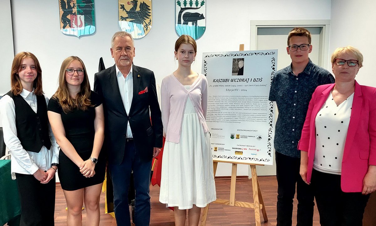 14 czerwca 2024 09:29Tymon Miszewski zdobył pierwsze miejsce, Zuzanna Stoltman drugie, zaś Olga Jacewicz trzecie. Czwarta była Marietta Szulc z tychże Swornegaci. Ich opiekunką była zdobywczyni tegorocznej Skry Ormuzdowej Marzena Borzyszkowska, charyzmatyczna nauczycielka języka kaszubskiego i znana w Sworach społeczniczka. (wszyscy na zdjęciu).