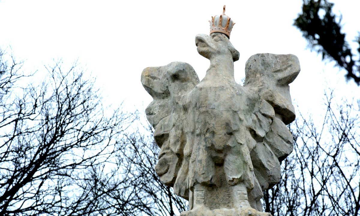 Orzeł na szczycie obelisku miał już kiedyś koronę, i to dwukrotnie. Pierwszy raz została ona zdemontowana przy okazji prac renowacyjnych pomnika w 1990 roku. Ponownie zainstalowano ją na początku 2013 roku. Wykonany z brązowej miedzi emblemat władzy nie zabawił jednak długo na głowie bielika.