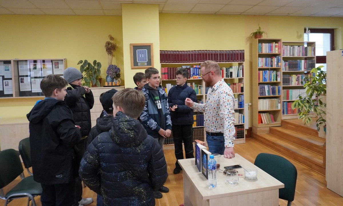 Na spotkanie z autorem przyszły klasy VIa i VIc ze Szkoły Podstawowej nr 7 wraz z paniami nauczycielkami. Na wstępie bibliotekarka Anna Maria Zdrenka przedstawiła prelegenta. Następnie prowadzący zadał pytanie w stronę publiczności: – „Kto gra na kompie? I padła odpowiedź: – „A kto nie gra!?”. Tyle i aż tyle wystarczyło, aby zainicjować trwającą 1,5 godziny burzliwą dyskusję o grach, internecie, pasjach, uzależnieniach, kryzysie graczy, youtuberach, streamerach, a także o pisaniu książek.