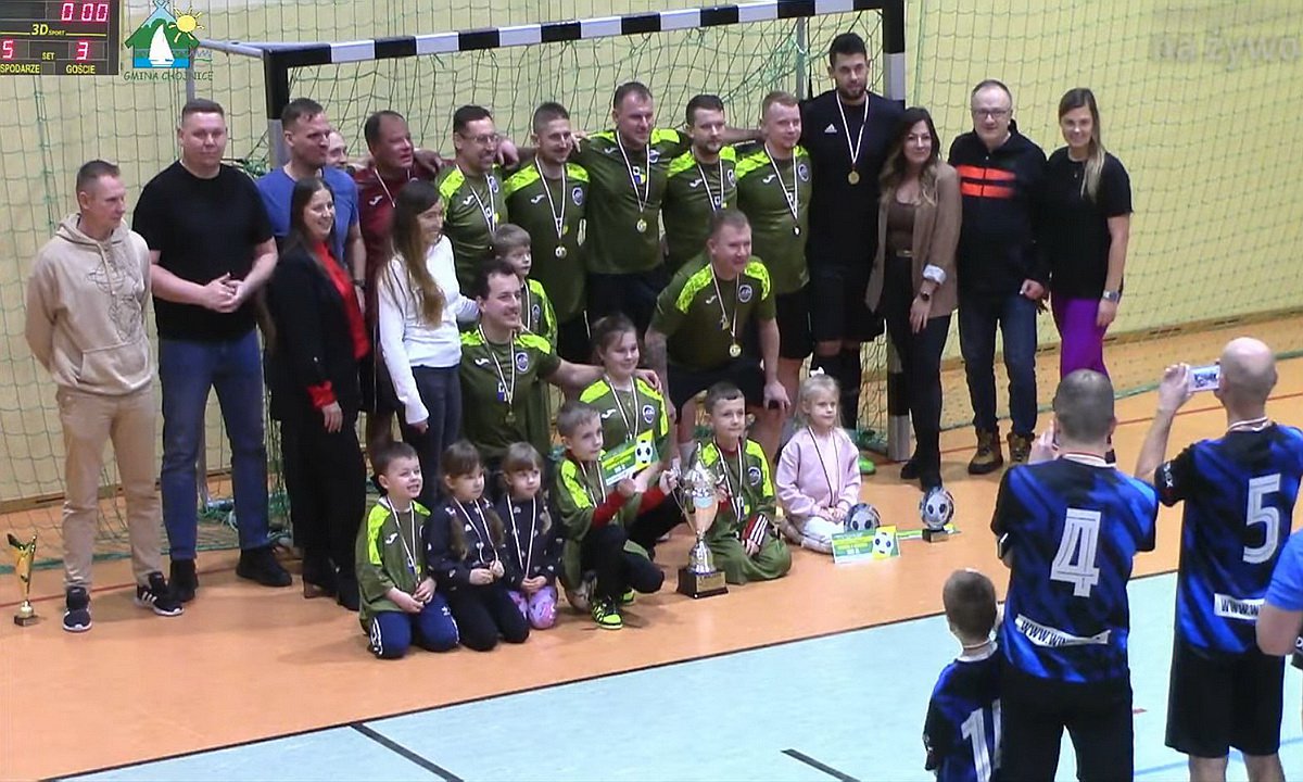 Medale i puchary dla najlepszych drużyn, strzelca i bramkarza wręczali (od 2.55.30) Przewodniczący Rady Gminy Chojnice Józef Kołak oraz szef Komisji Sportu w RG Paweł Wieczorek.