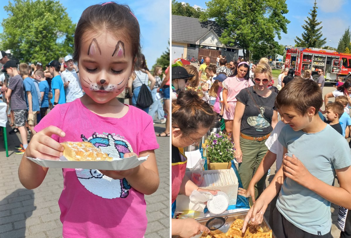 W szkolnej stołówce każdy miał możliwość poczęstowania się pyszną pomidorówką serwowaną ze świeżym chlebem podarowanym przez pobliską piekarnię “Brunka”. Ogromną popularnością cieszyły się pieczone na bieżąco gofry oraz ciasta i ciasteczka upieczone przez rodziców naszych uczniów. Piknik rozpoczęli uczniowie klas I-III występami artystycznymi, a zakończony został pokazem talentów klas starszych. Dziękujemy wszystkim za obecność, a dzieciom z okazji jutrzejszego Dnia Dziecka życzymy dużo uśmiechu i radości na co dzień!