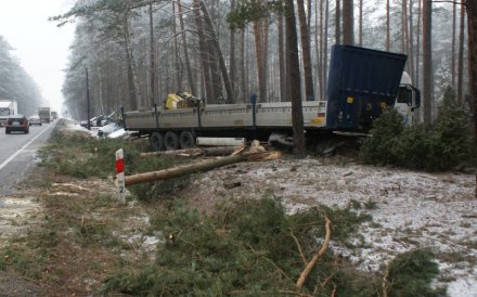 Man nie zatrzymał się w przydrożnym rowie, wjechał do lasu, ścinając przy tym kilka drzew. Uczestnicy kolizji nie odnieśli obrażeń, byli trzeźwi. Najbardziej uszkodzony został samochód ciężarowy.