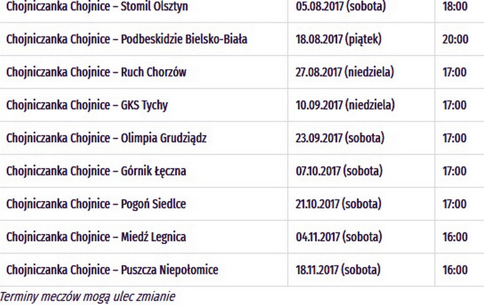 Chojniczanka ustaliła już terminy jesiennych spotkań u siebie. Z zastrzeżeniem, że mogą one jeszcze ulec zmianie, chociażby przez transmisje telewizyjne.