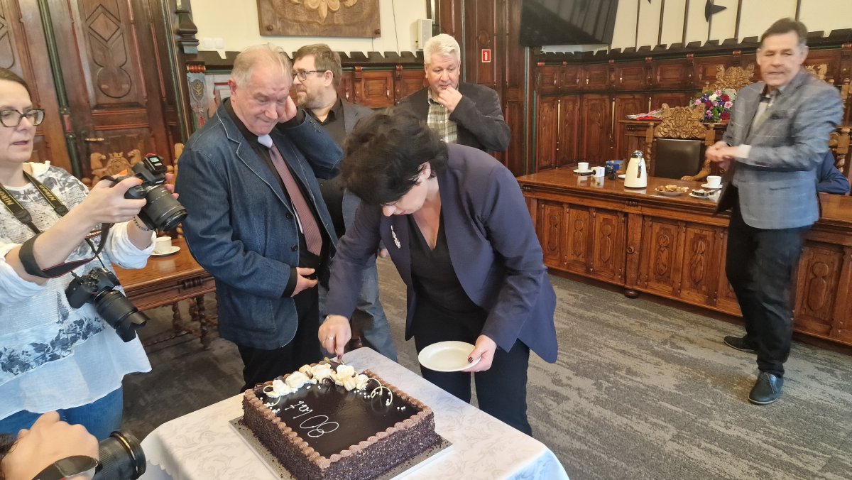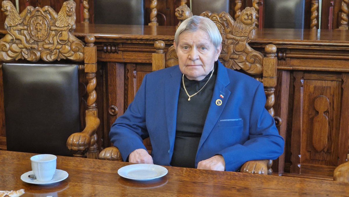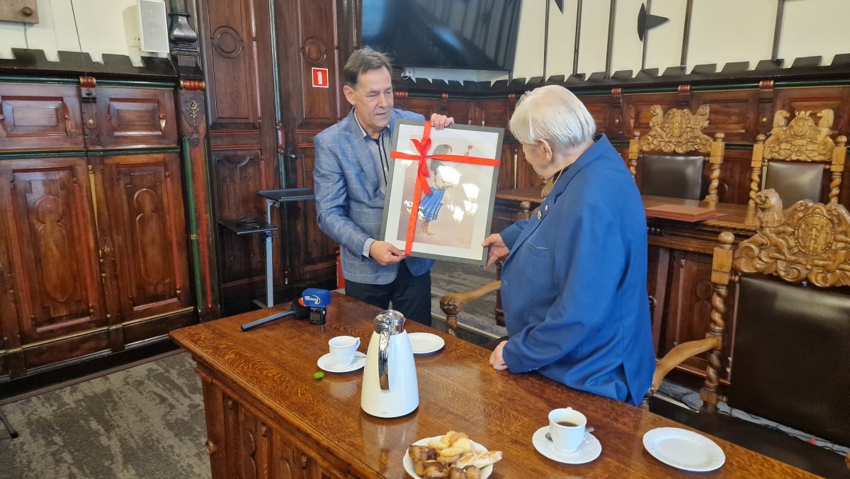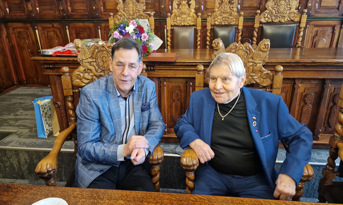 Dziś burmistrz uhonorował Kazimierza Poterackiego tytułem Zasłużonego Obywatela a także złożył życzenia z okazji jego urodzin. W tym szczególnym dniu Jubilatowi towarzyszyła żona, rodzina i przyjaciele. Były kolejne życzenia, podziękowania i kwiaty.