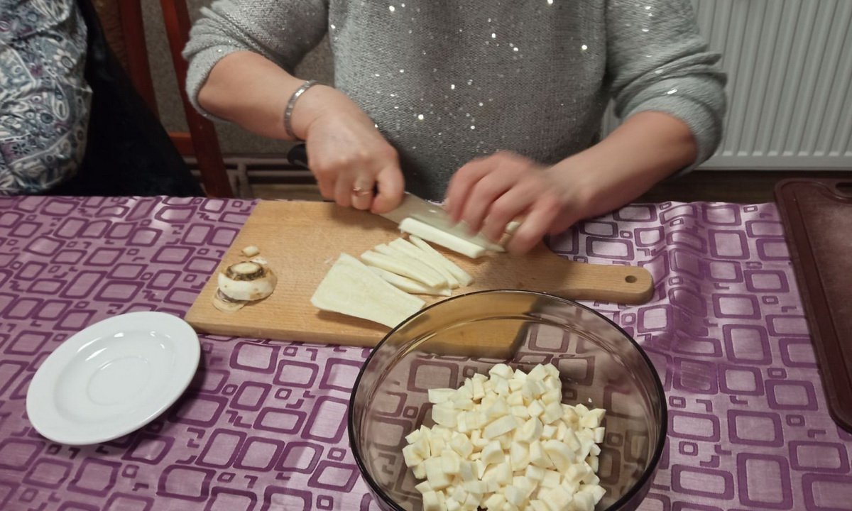 Podczas ostatnich zajęć kulinarnych postawiliśmy na wartości odżywcze przygotowywanego dania. Wspólnie, po przeanalizowaniu różnych przepisów, udało nam się przygotować zupę z gruszki i pietruszki. Nazwa brzmi niebanalnie - zapewniamy, że i smak jest wyjątkowo ciekawy. Zupa ma bardzo dużo witamin, potrzebnych zwłaszcza w sezonie zimowym. Nasi seniorzy zadbali o wszystkie szczegóły podczas przygotowania dania.