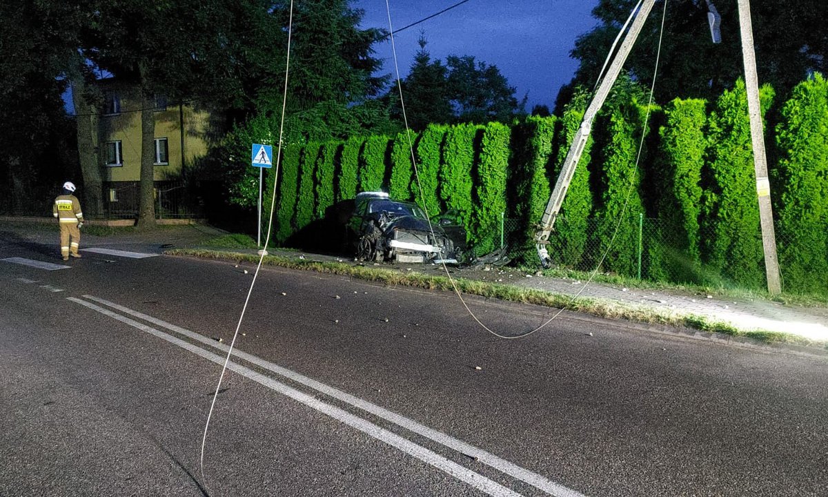 Na miejscu było także pogotowie energetyczne, ponieważ pojazd wjechał w słup i uszkodził linię energetyczną. | fot. KPPSP Chojnice