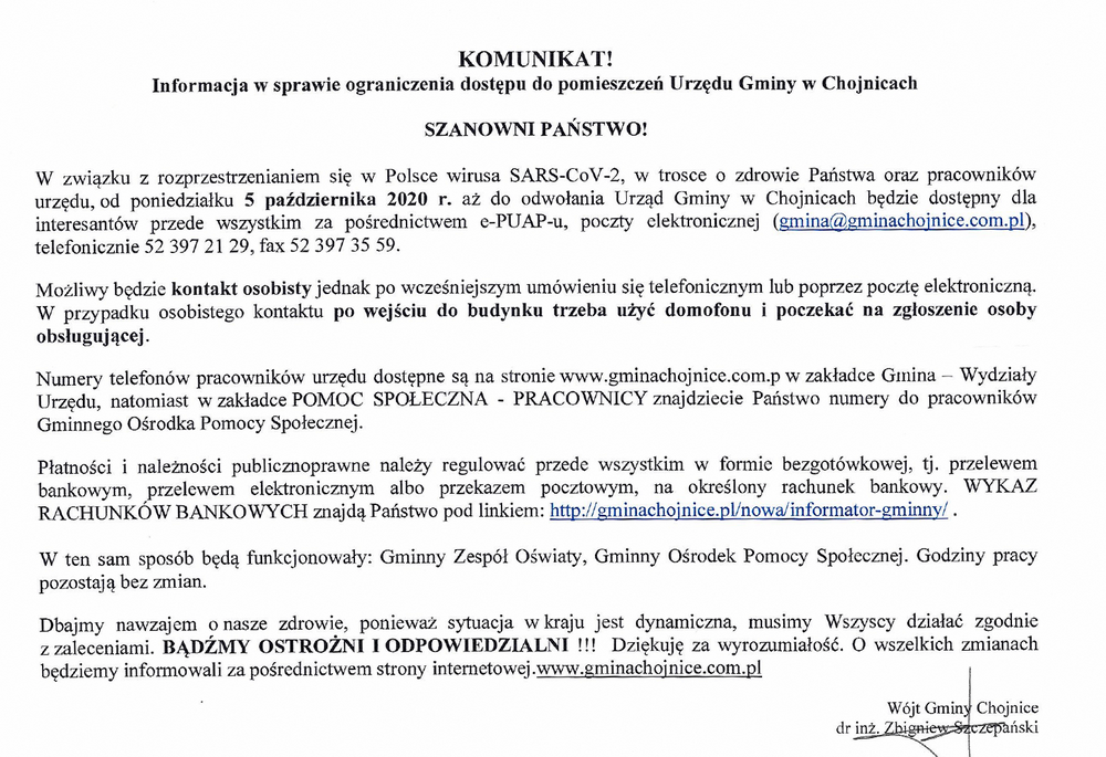 W związku z informacjami o zmianie w obsłudze klientów, informujemy że Urząd Gminy w Chojnicach rekomenduje załatwianie spraw głownie za pośrednictwem Internetu lub telefonicznie.