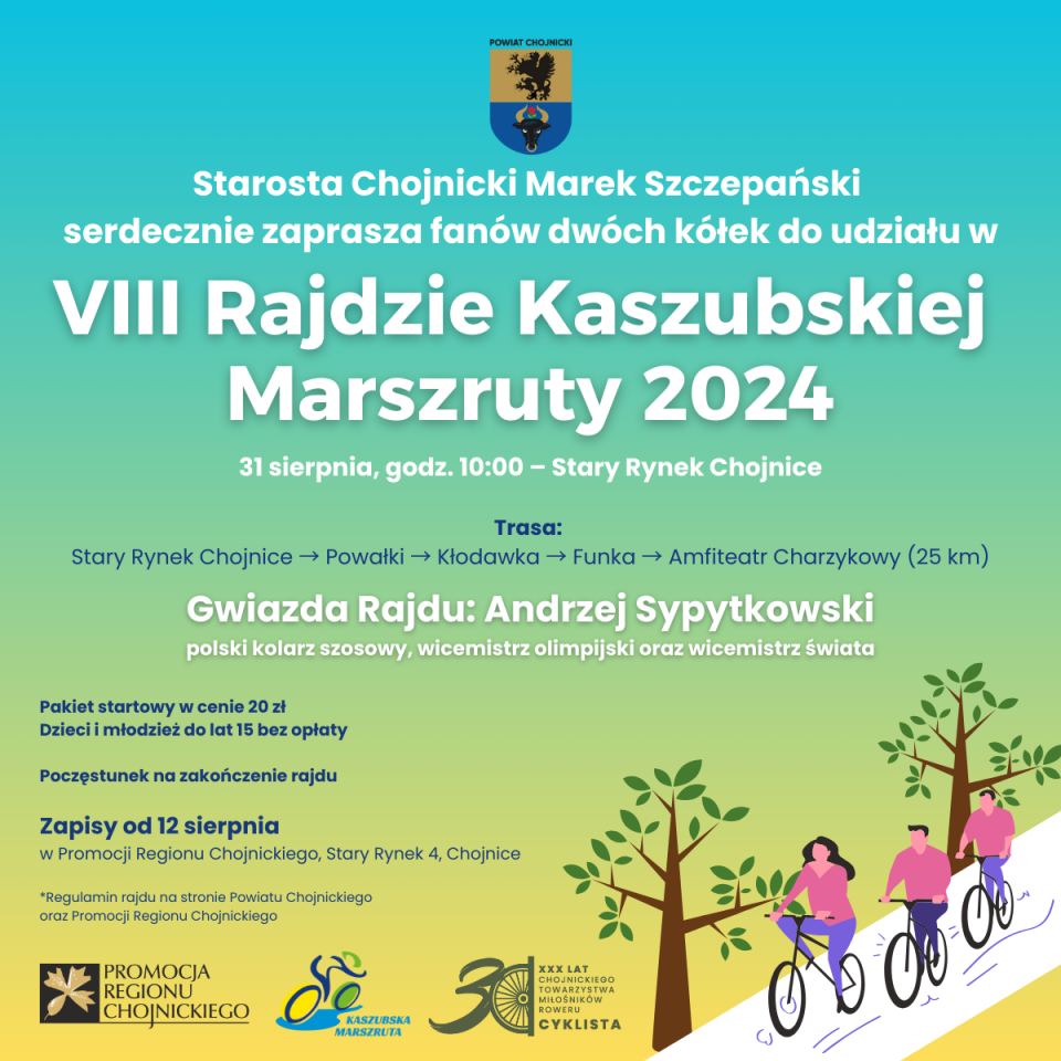 Andrzej Sypytkowski - polski kolarz szosowy, wicemistrz olimpijski oraz wicemistrz świata będzie gwiazdą VIII Rajdu Kaszubskiej Marszruty. W tym roku cykliści pokonają odcinek ze Starego Rynku w Chojnicach do Charzyków.