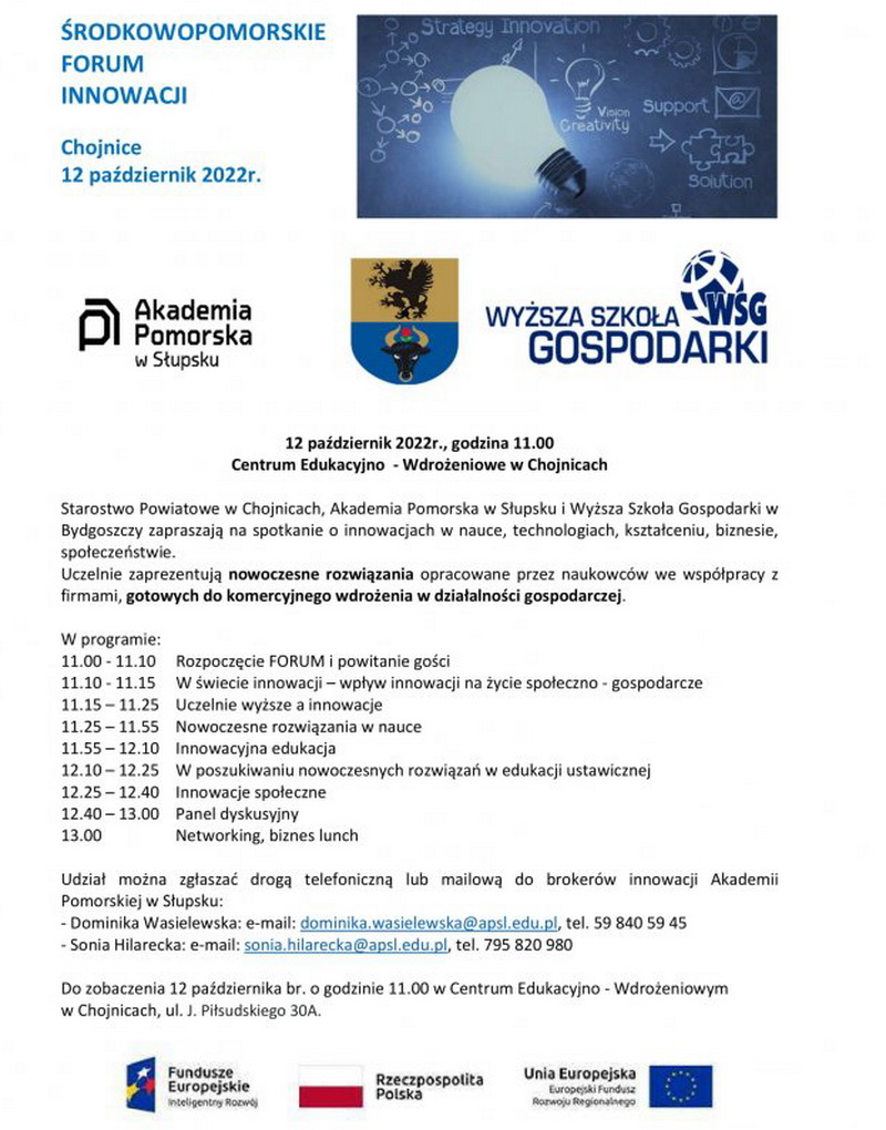 Starostwo Powiatowe, Akademia Pomorska w Słupsku oraz Wyższa Szkoła Gospodarki w Bydgoszczy zapraszają na Środkowopomorskie Forum Innowacji, które odbędzie się 12.10.2022 (środa) o godz. 11.00 w Centrum Edukacyjno-Wdrożeniowym w Chojnicach.