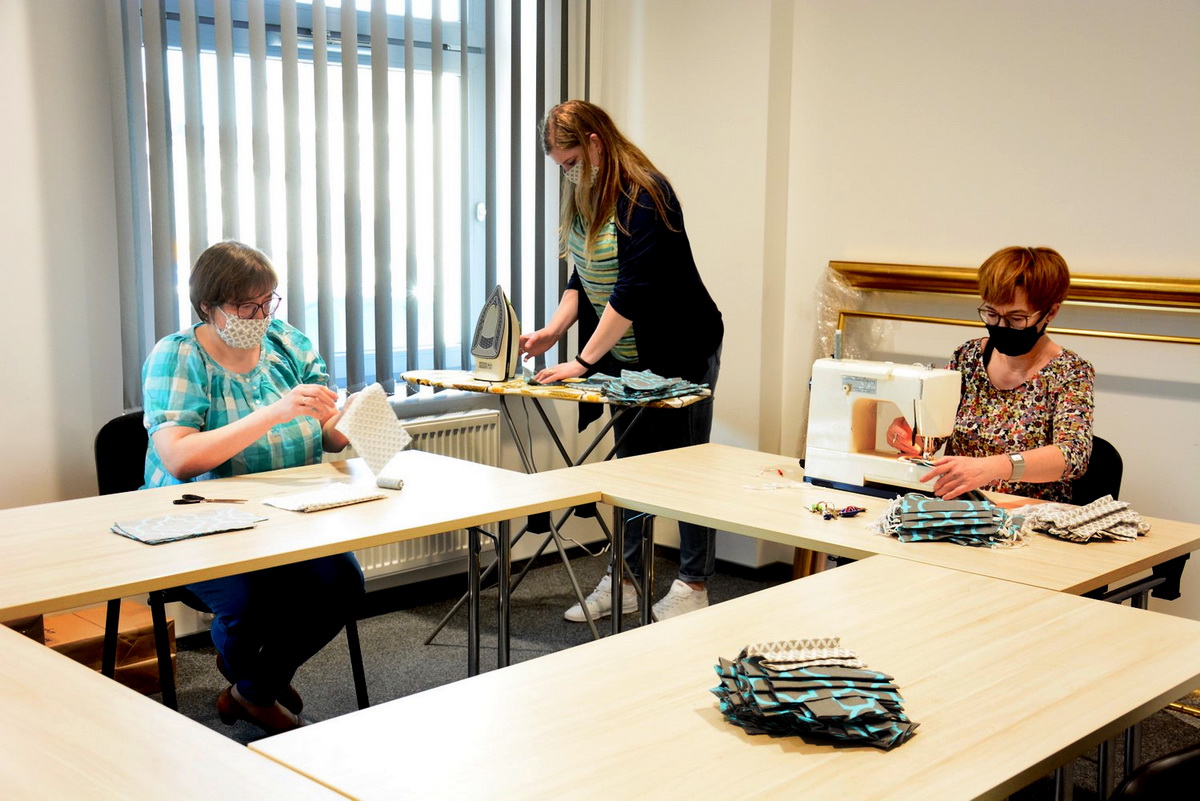 Podczas wspólnej pracy nie ma osób, które stały by z boku i tylko się przyglądały. Każdy ma przydzielone jakieś zadanie. - Wedle umiejętności - żartują pracownicy. I tak, ktoś wymierza i tnie gumki „zauszniki”, a ktoś inny je przyszywa. Kolejna osoba zaprasowuje charakterystyczne dla maseczek marszczenia, a ktoś inny w tym czasie np. fastryguje.