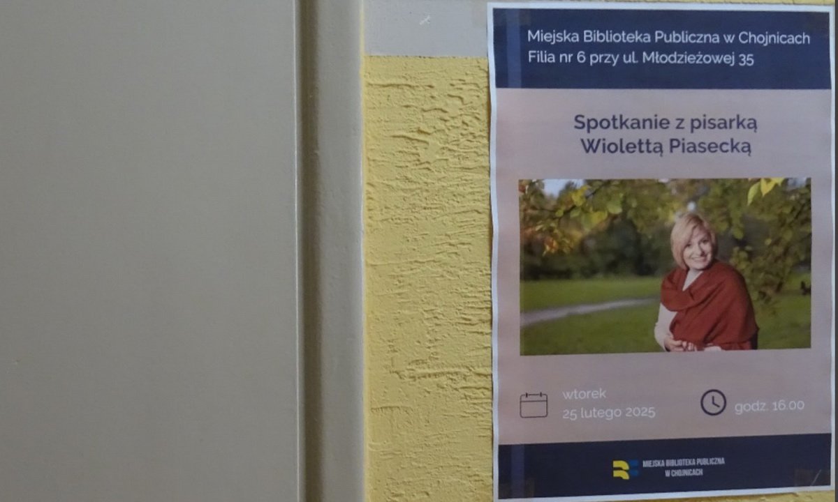 Filia nr 6 Miejskiej Biblioteki Publicznej w Chojnicach przy ul. Młodzieżowej 35 zaprasza na spotkanie z pisarką Wiolettą Piasecką, które odbędzie się we wtorek 25 lutego. Początek o godz. 16.00.