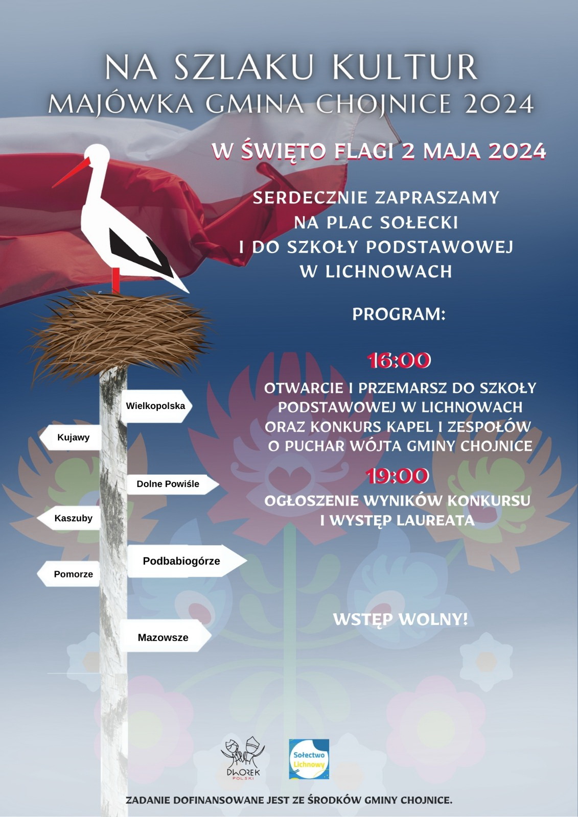 W czwartek 2 maja w Święto Flagi o godzinie 16.00 zespoły uczestniczące w Majówce Gminy Chojnice i Konkursie Kapel i Zespołów o Puchar Wójta Gminy Chojnice Zbigniewa Szczepańskiego spotykają się na placu sołeckim przy remizie OSP i świetlicy. Stamtąd w uroczystym korowodzie nastąpi przemarsz do miejscowej Szkoły Podstawowej. Tam około godz. 19.00 będzie ogłoszenie wyników i występ laureata.