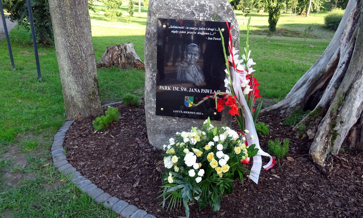 „Solidarność – to znaczy jeden i drugi. Nigdy jeden przeciw drugiemu” – ten cytat z Homilii św. Jana Pawła II z Mszy w Gdańsku – Zaspie w 1987 znalazł się na tablicy okolicznościowej na obelisku w parku jego imienia w Lotyniu.