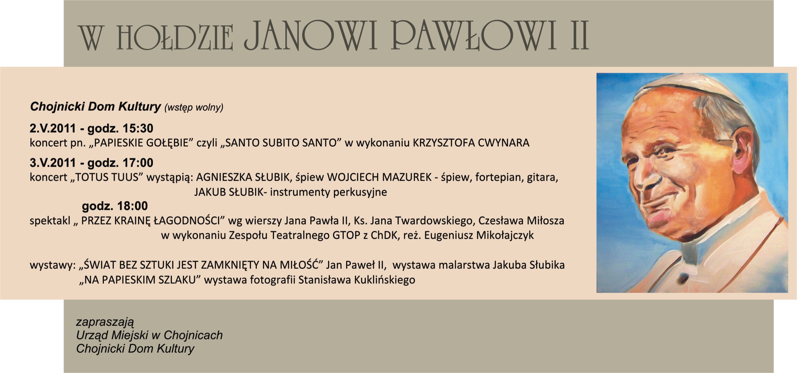 Z okazji zbliżających się uroczystości beatyfikacji Jana Pawła II, Chojnicki Dom Kultury i Urząd miejski zapraszają 2 i 3 maja na koncert, spektakl i wystawę fotograficzną i malarską poświęconą Karolowi Wojtyle.