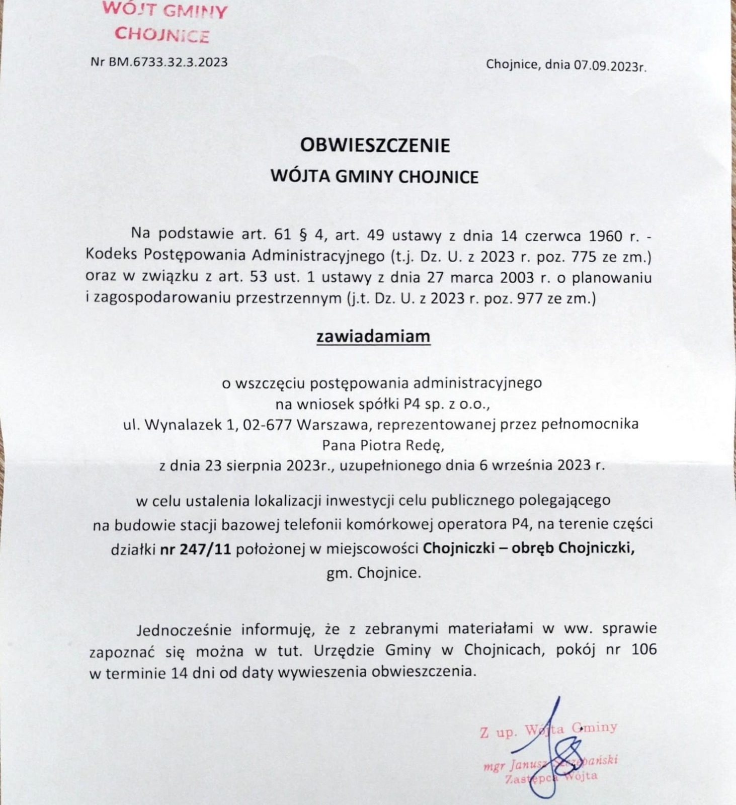 13 września 2023 10:27O tym planie poinformował niedawno na profilu FB Sołectwa Chojniczki jego sołtys Tomasz Sujak. Maszt miałby stanąć przy ul. Chojnickiej niedaleko skrzyżowania z ul. Sosnową, pomiędzy ulicami Długą i właśnie Chojnicką. Zawiadomienie z Urzędu Gminy Chojnice o wszczęciu postępowania administracyjnego „w celu ustalenia lokalizacji inwestycji celu publicznego polegającego na budowie stacji bazowej telefonii komórkowej operator P4” pojawiło się także w gablotach informacyjnych na terenie Sołectwa.