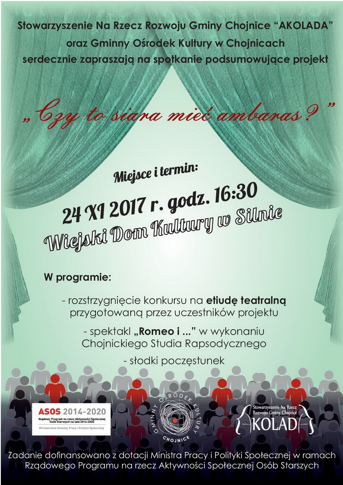 Stowarzyszenie na Rzecz Rozwoju Gminy Chojnice "Akolada" oraz Gminny Ośrodek Kultury w Chojnicach zapraszają 24 listopada o godz. 16"30 na spotkanie podsumowujące realizację projektu „Czy to siara mieć ambaras?”