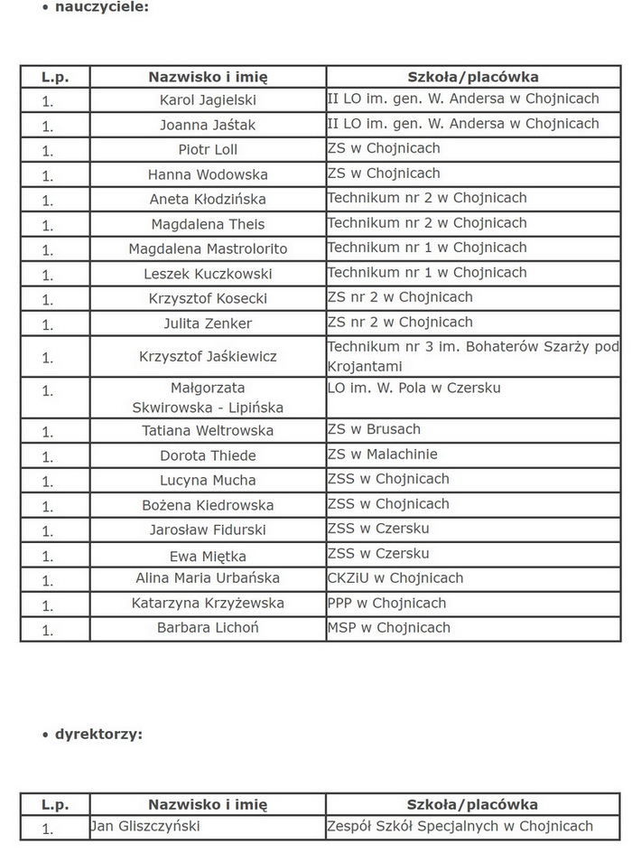 Poinformował, że zarząd powiatu przychylił się do wniosków, jakie wpłynęły ze szkół i przeznaczył pół miliona złotych na zakup pomocy dydaktycznych i sprzętu, o który wnioskowały placówki. Jan Gliszczyński, dyrektor Zespołu Szkół Specjalnych w Chojnicach, w imieniu swoich koleżanek i kolegów podziękował nie tylko za nagrody, ale także za to, Powiat Chojnicki jaki organ prowadzący ma zawsze na uwadze dobro kierowanych przez siebie placówek.