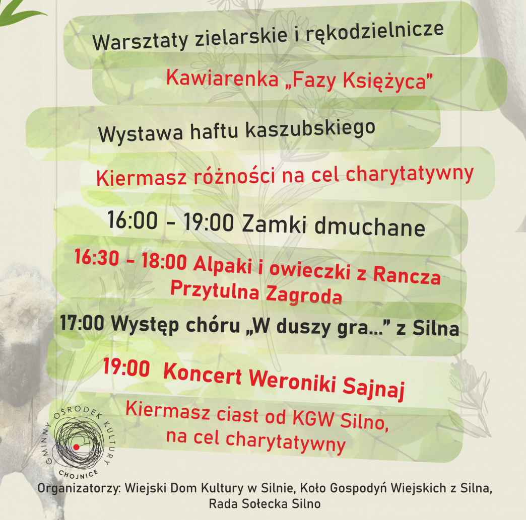 Podczas Festynu odbędą się warsztaty rękodzielnicze i zielarskie, będzie wystawa haftu kaszubskiego, kiermasz różności oraz ciast z miejscowego KGW na cel charytatywny. Dla dzieci będą obowiązkowe na festynach dmuchańce oraz alpaki i owieczki. Na scenie wystąpi chór z Silna pn. „W duszy gra…” oraz Weronika Sajnaj z ChCK.