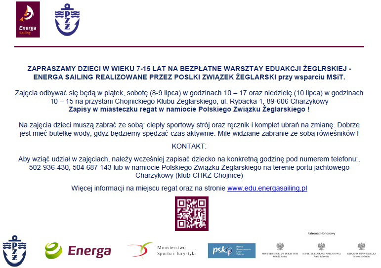 Chojnicki Klub Żeglarski, w związku z organizacją regat „Energa Sailing Cup – Puchar ChKŻ Chojnice” wraz z Energą i Polskim Związkiem Żeglarskim zaprasza wszystkie dzieci w wieku 7-15 lat na bezpłatne warsztaty edukacji żeglarskiej.