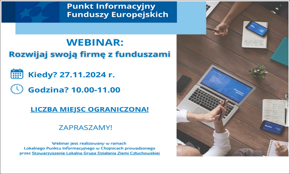 Lokalny Punkt Informacyjny Funduszy Europejskich w Chojnicach zaprasza na bezpłatne webinarium „Rozwijaj swoją firmę z funduszami”. Webinar odbędzie się w środę 27 listopada w godz. 10.00 – 11.00.