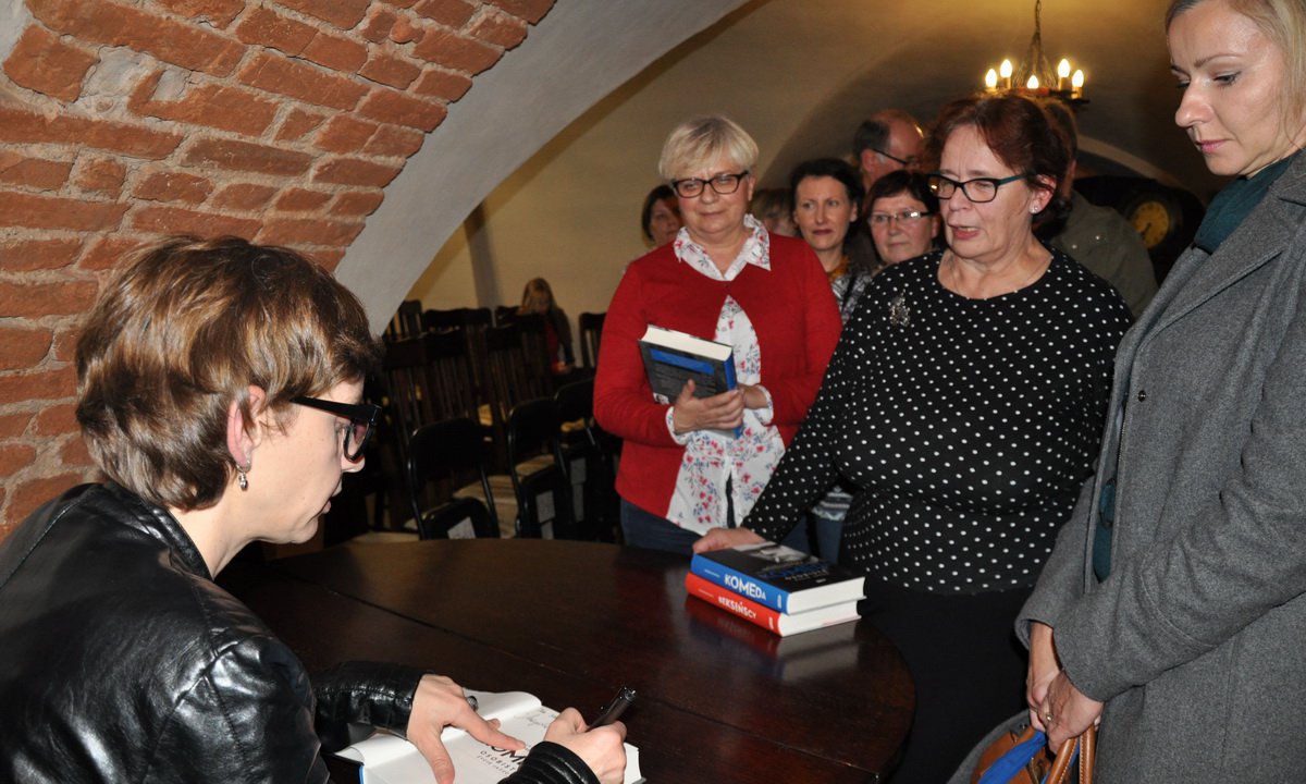 Rozmowę z pisarką poprowadził Marcin Szopiński, inicjator spotkania. A księgarnia Świat Książki przygotowała na ten wieczór nie tylko ostatnią książkę Grzebałkowskiej, ale także poprzednie jej publikacje – o ks. Twardowskim, rodzinie Beksińskich i o roku 1945. Było więc w czym przebierać, a niektórzy wychodzili obładowani sporym sztaplem książek.