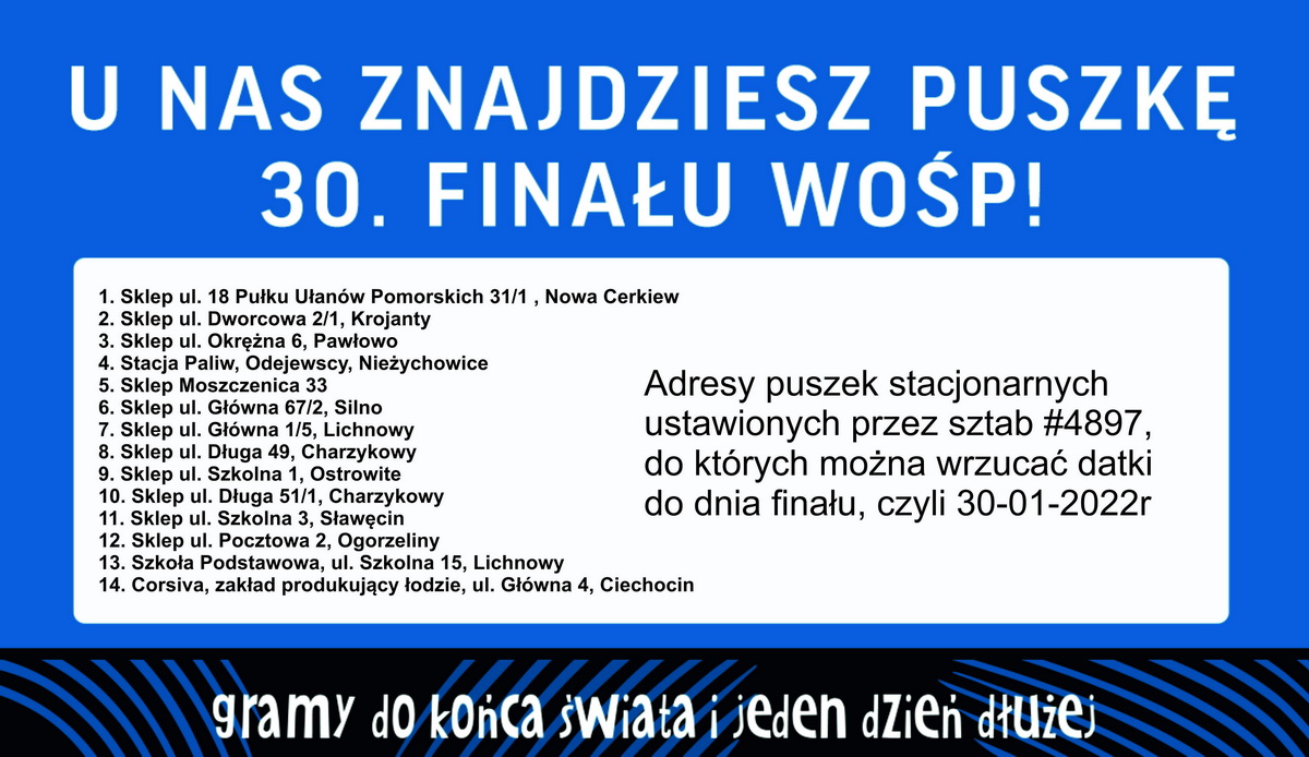 W tym roku, jak i w poprzednich trzech latach, gminny sztab #4897, utworzony został przez Stowarzyszenie Inicjatyw Społecznych “Pomorze”, w Wiejskim Domu Kultury w Silnie.