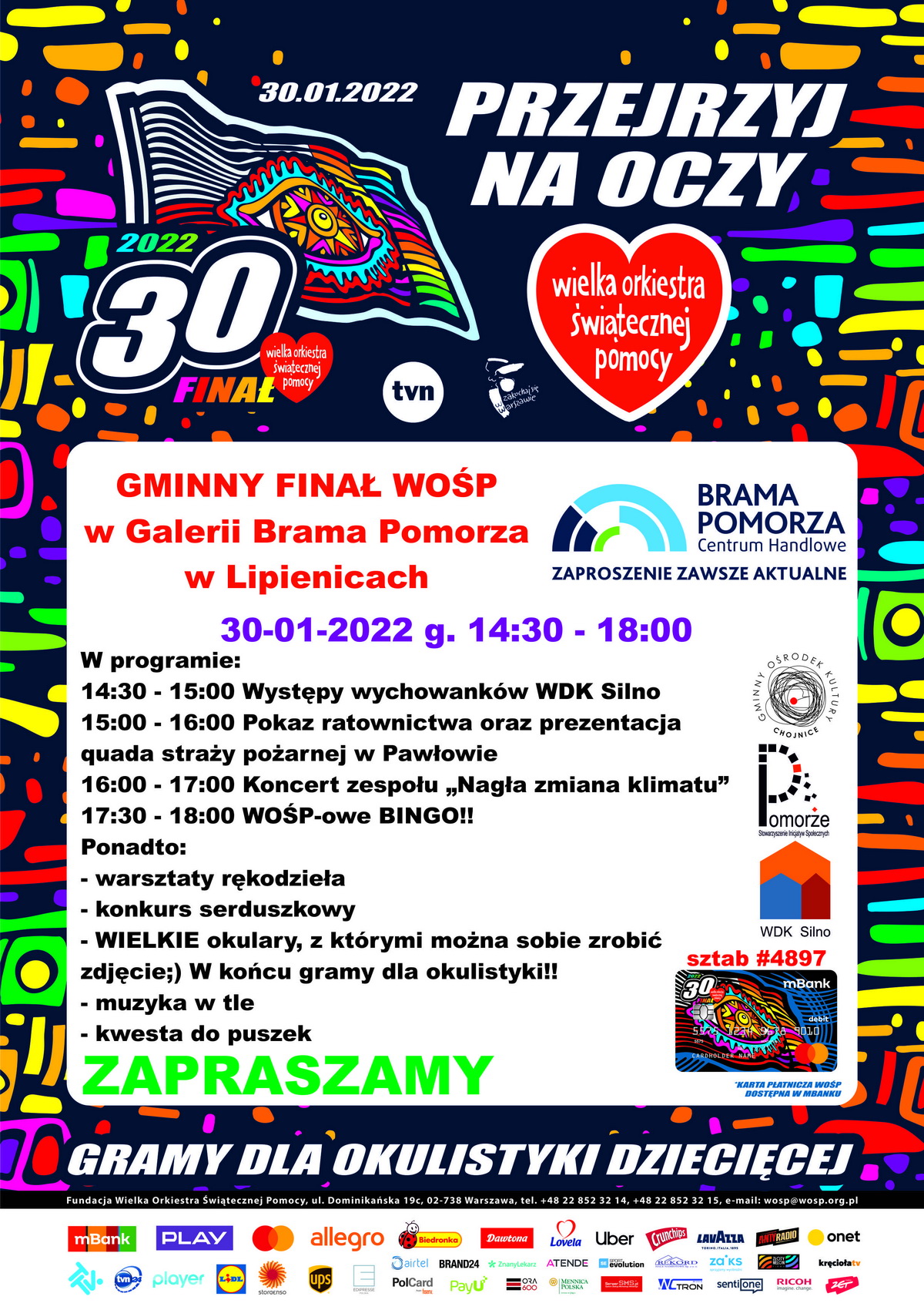 Podczas finałów odbywać się będą koncerty, zabawy dla dzieci, warsztaty rękodzielnicze, konkursy i inne atrakcje. Nasi wolontariusze poruszać się będą w różnych miejscowościach gminy Chojnice, będzie można ich spotkać po Mszach Świętych, ale nie tylko. Jeżeli ktoś chciałby zasilić WOŚP w dniach poprzedzających finał, może również skorzystać ze stojących w 14 miejscach, puszek stacjonarnych naszego sztabu. Lista tych miejsc znajduje się na plakacie.