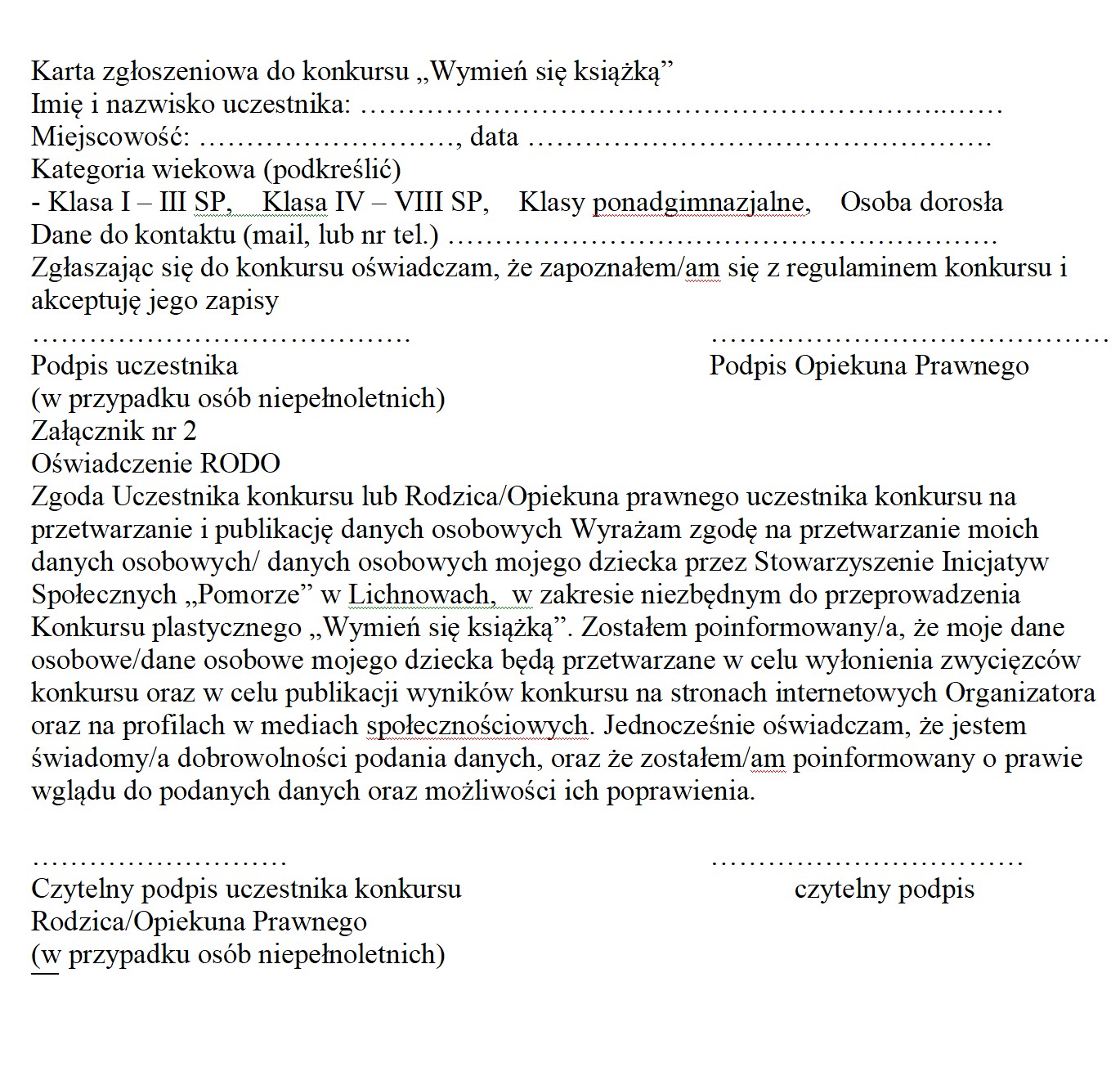 Każdy uczestnik konkursu wyraża zgodę na publikację pracy oraz udostępnienie swojego imienia i nazwiska w dostępnych mediach oraz dla celów dokumentacyjnych i promocyjnych wydarzenia