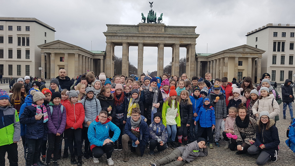 Wizytę w stolicy Niemiec uczniowie z opiekunami rozpoczęli od spaceru wokół Bramy Brandenburskiej, gdzie grupa szukała odpowiedzi na pytanie, dlaczego słynna kwadryga na bramie zwrócona jest ku wschodowi? Kim jest ten dziwny ludzik na sygnalizacji świetlnej? Dlaczego liczni tubylcy jeżdżą na rowerach? Jest to ćwiczeniem fizycznym wymagającym odwagi, ponieważ masa kierowców chce dać im nauczkę, gdyż niejeden z rowerzystów z zasady ignoruje kolor czerwony w sygnalizacji ulicznej.