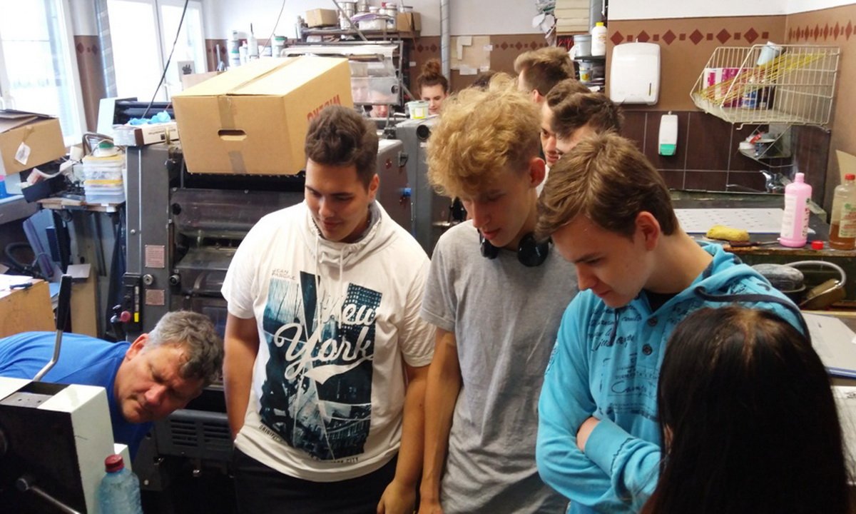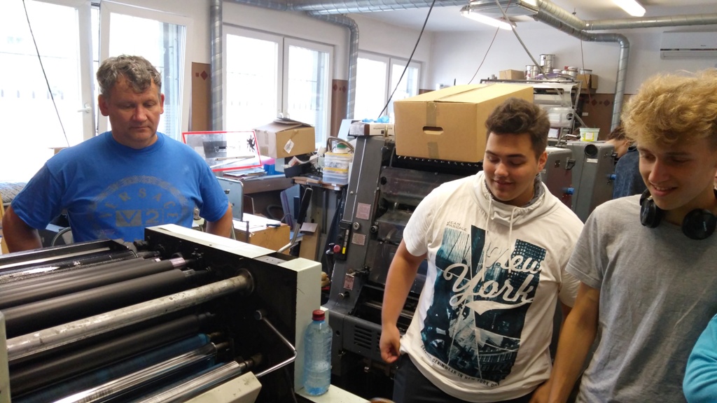 Dzięki życzliwości właścicieli, uczniowie odwiedzili drukarnię "Druk Kolor" Jacka Szyszki oraz drukarnię "Certus". Pan Jacek z pełnym profesjonalizmem opowiedział o procesie produkcyjnym w druku offsetowym, a uczniowie mogli poobserwować proces produkcji akcydensu (wyrób jednoarkuszowy, który może być w postaci jednej kartki, lub nierozciętej składki).