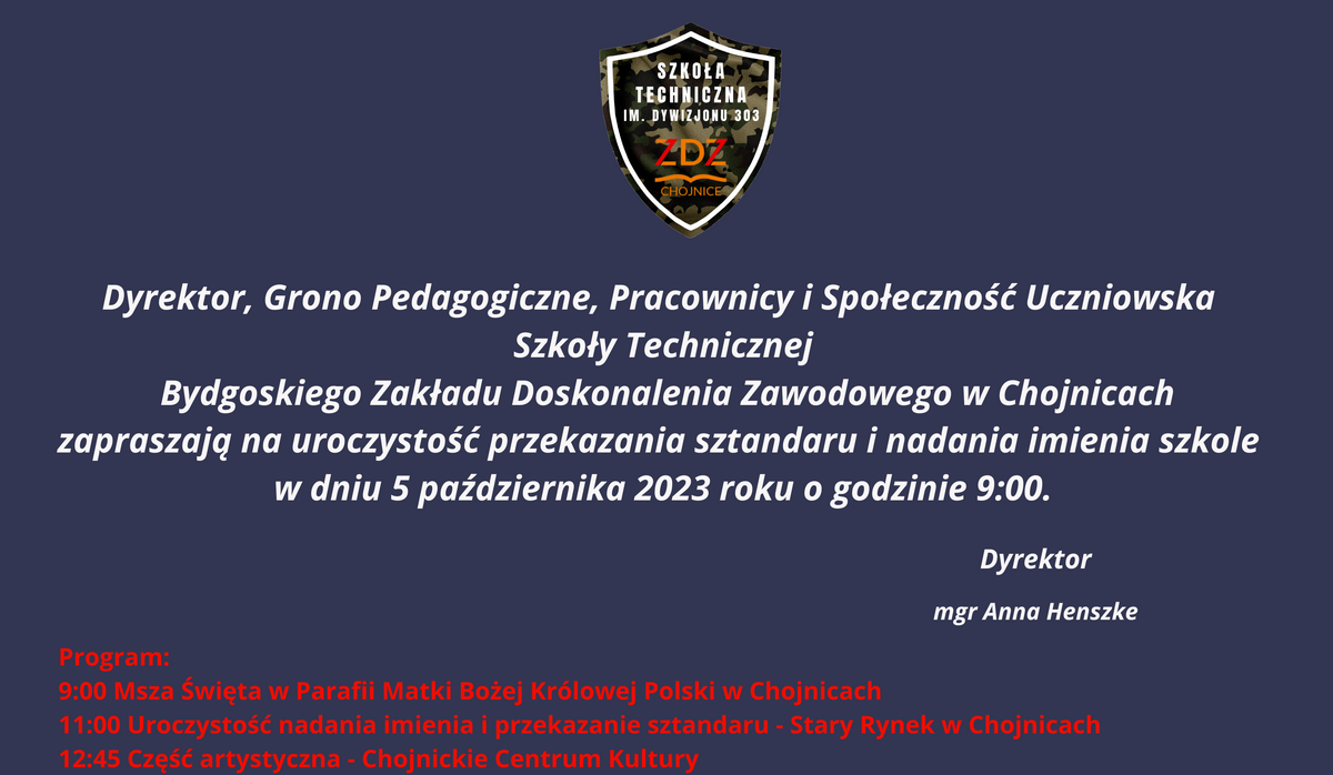 Dyrekcja, grono pedagogiczne, uczniowie zapraszają rodziców, absolwentów i przyjaciół szkoły na uroczystość przekazania sztandaru i nadania imienia szkole Uroczystość odbędzie się w ChCK, a liczba miejsc jest ograniczona.