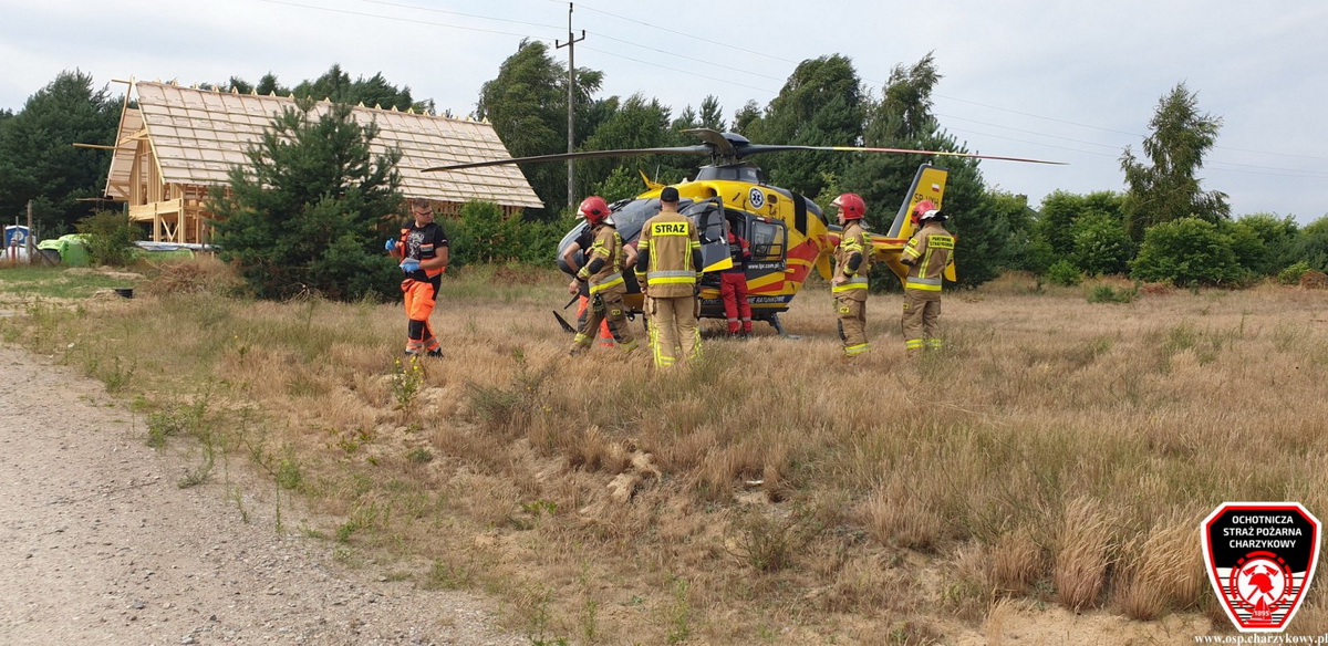 Mężczyzna, który spadł z wysokości - śmigłowcem został przetransportowany do szpitala. | fot. OSP Charzykowy
