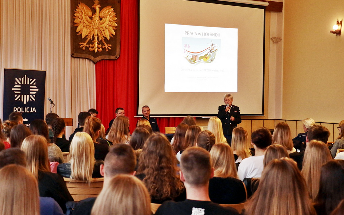 Wyzysk w pracy, praca przymusowa, niewolnictwo - wszystko to podlega pod definicję handlu ludźmi. O tym, jak przygotować się do bezpiecznego wyjazdu do Holandii, mówiła w LO Irena de Ruig z garnizonu Oost - Nederland z Narodowej Policji Holenderskiej.