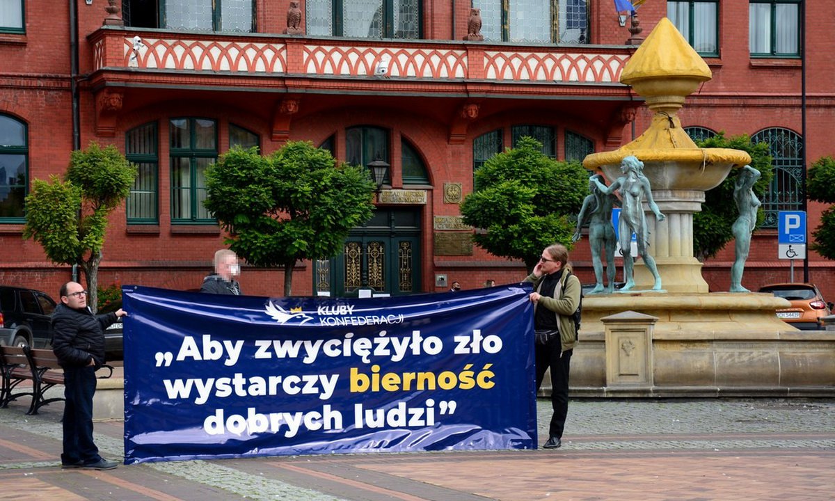 Dzisiaj (17.10.), chwilę przed południem na Starym Rynku w Chojnicach pojawiło się trzech mężczyzn z banerem głoszącym, że „Aby zwyciężyło zło wystarczy bierność dobrych ludzi”. Zainterweniowała policja.