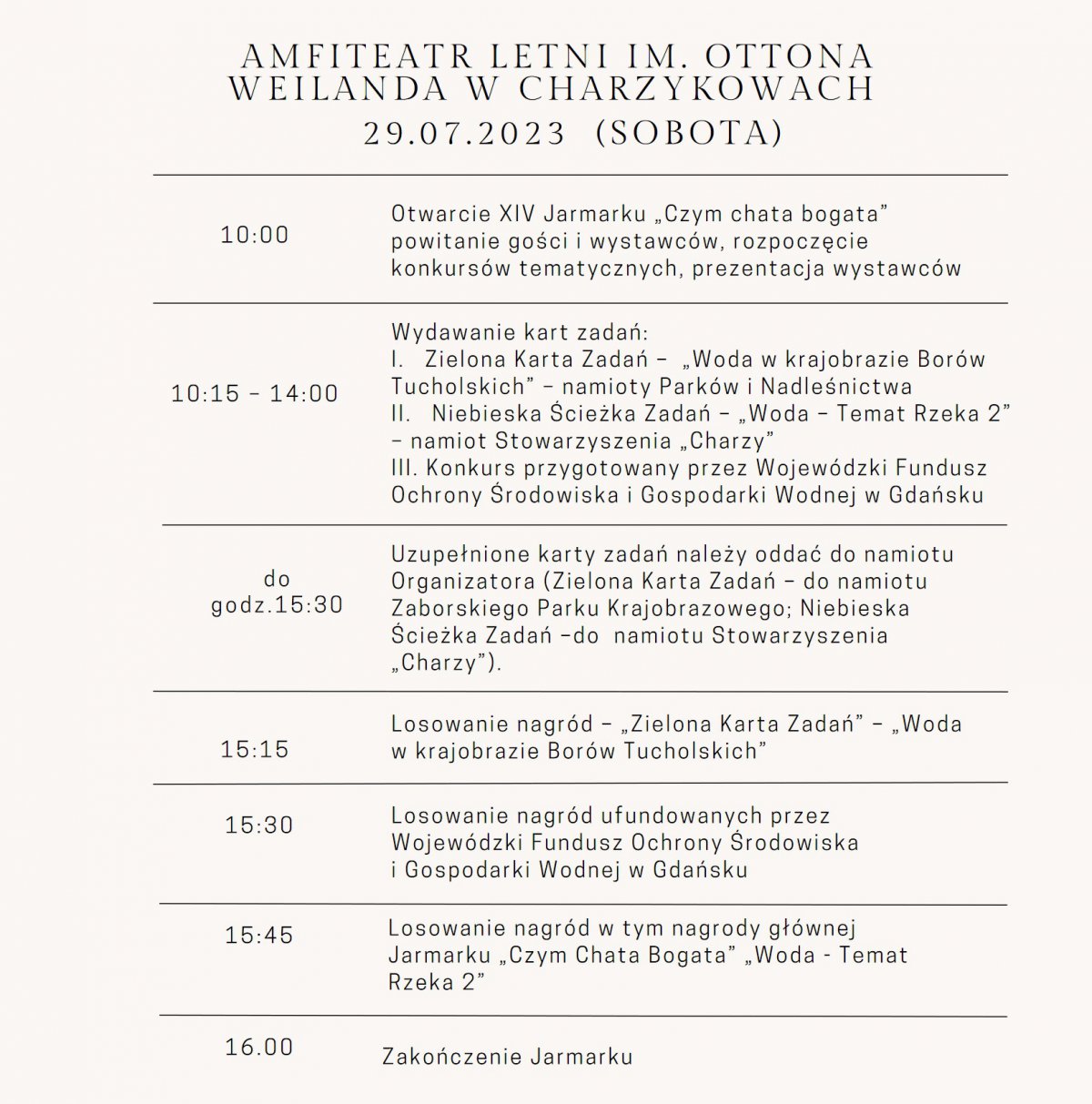 Sobota będzie dniem charzykowskiego eko jarmarku, „Czym chata bogata”. Tradycyjnie obfitować będzie w dobra wytworzone przez lokalnych rękodzielników. A wszystko to „okraszone” będzie edukacyjnymi grami i zabawami.