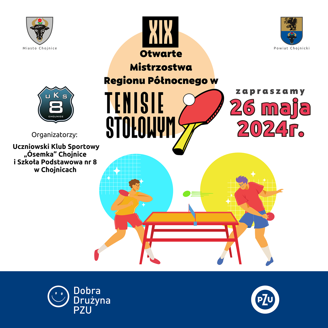 Uczniowski Klub Sportowy „ÓSEMKA” Chojnice i Szkoła Podstawowa nr 8 zapraszają na XIX Otwarte Mistrzostwa Regionu Północnego w Tenisie Stołowym. Zawody odbędą się 26 maja w sali gimnastycznej szkoły.