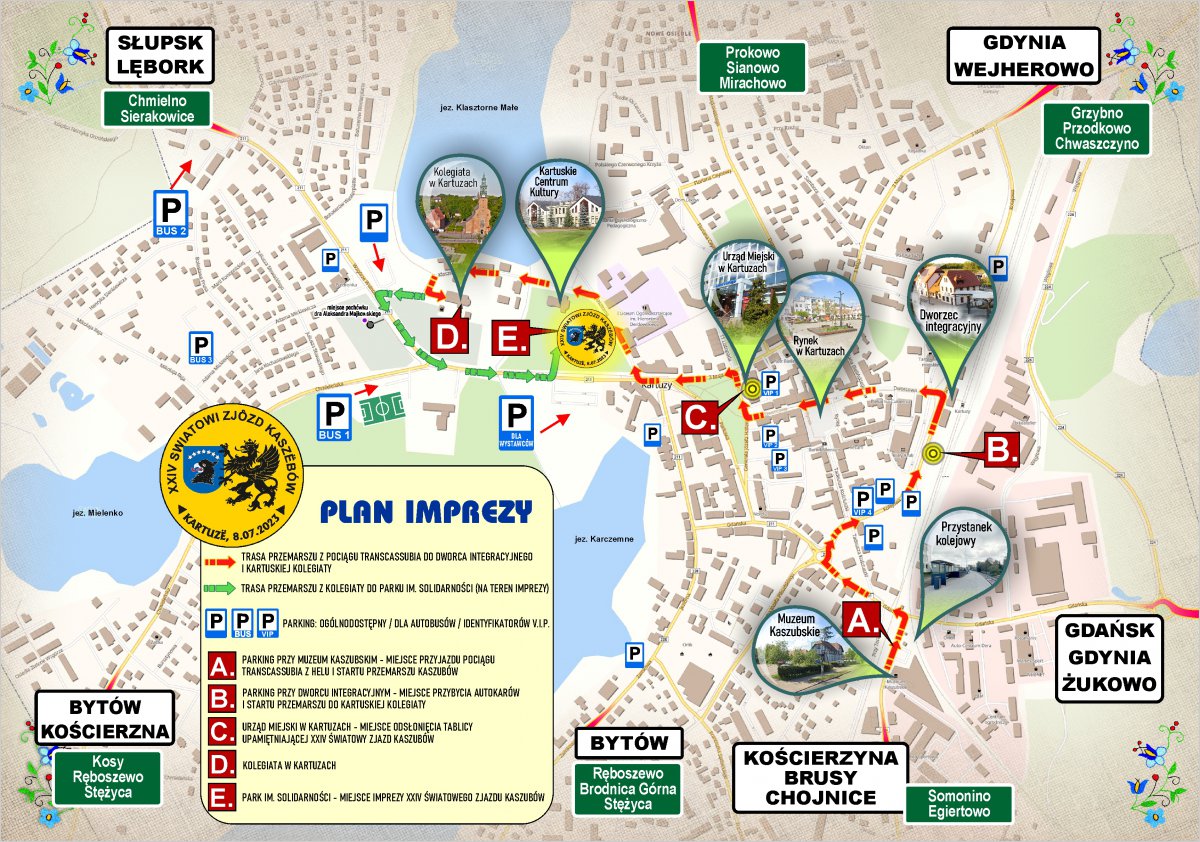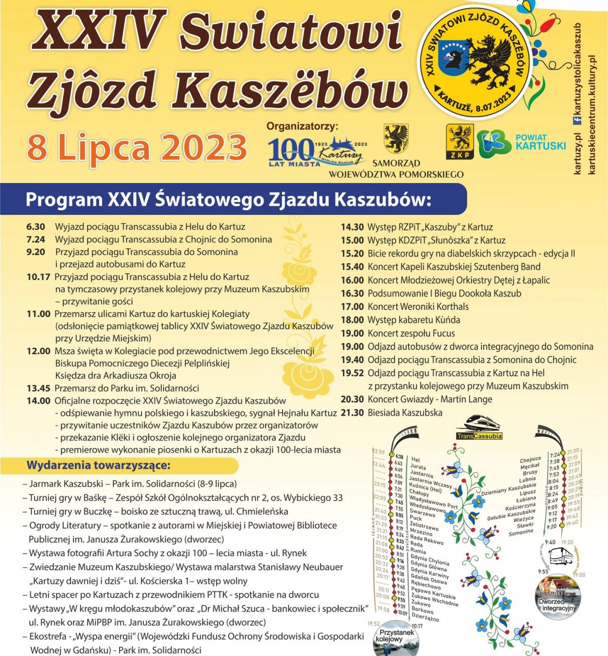 Głównym organizatorem Zjazdu jest Zrzeszenie Kaszubsko – Pomorskie. Jak co roku na miejsce Zjazdu jego uczestników będą dowozić specjalne pociągi pn. Transcassubia. Jak informuje na swej stronie ZK-P, w tym roku koszt biletu w obie strony (niezależnie od kursu, czyli i z Helu, i z Chojnic), to 20 zł. Bilety będzie można kupić u „banowych” w pociągu i na stronie www.kaszubskaksiazka.pl. Pociąg z Chojnic (wyjazd o 7.24) kończy bieg w Somoninie, do Kartuz podstawione będą autobusy. W drodze powrotnej o 19.00 wyjeżdżają specjalne autobusy z Kartuz na stację w Somoninie.