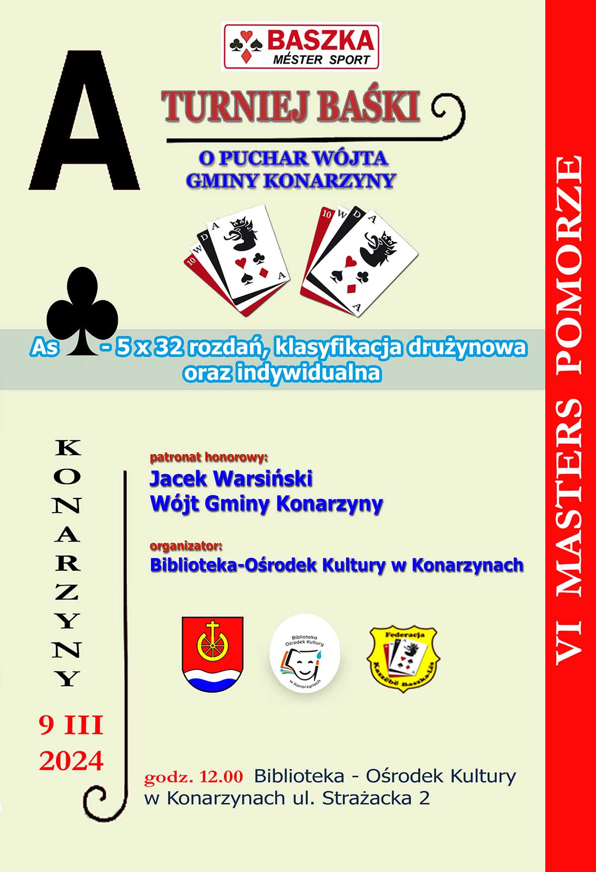 W sobotę 9 marca o godz. 12 w Bibliotece - Ośrodku Kultury w Konarzynach zostanie rozegrany Turniej Kaszubskiej Baśki o Puchar Wójta Gminy Konarzyny Jacka Warsińskiego. Zawody odbywają się zawsze w miłej i przyjaznej atmosferze rywalizacji sportowej.
