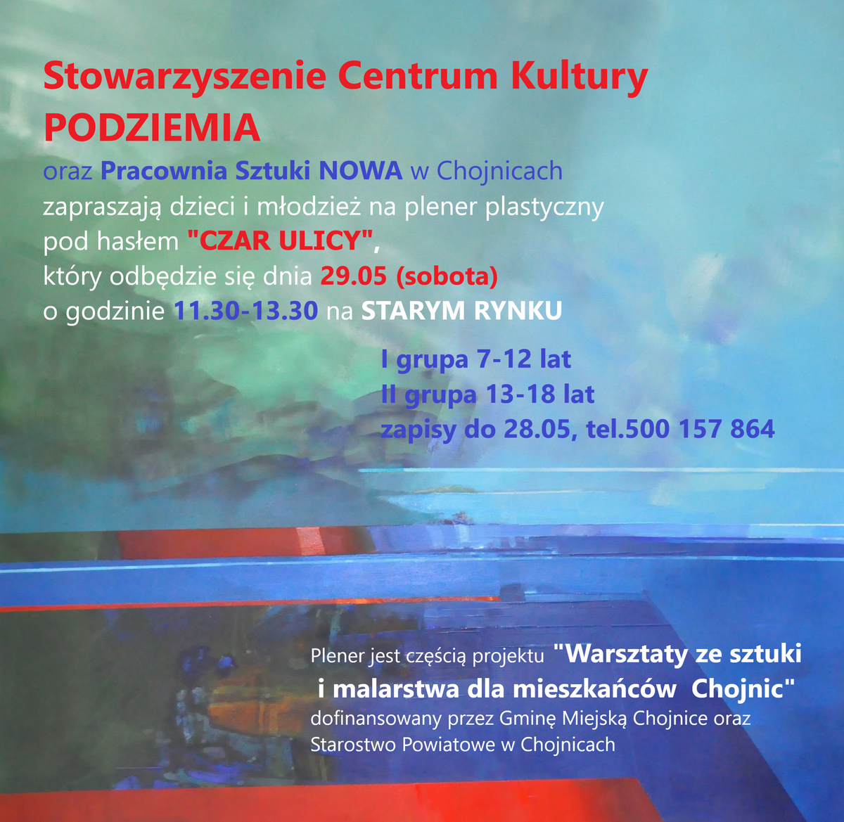 Będę pracować w dwóch grupach (7-12 lat, 13-18 lat) i indywidualnie. Prace plenerowe będą wykonywane różnymi technikami plastycznymi, w tym eksperymentalnymi, aby utrwalić to, co najpiękniejsze w sercu miasta. Pozostałe informacje na plakacie.