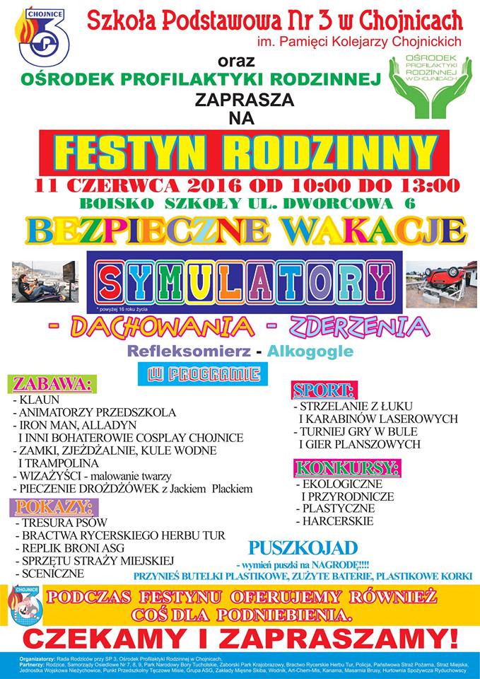 Organizatorzy festynu, Szkoła Podstawowa nr 3 i Ośrodek Profilaktyki Rodzinnej w Chojnicach zapraszają na pełny atrakcji festyn, który odbędzie się w sobotę 11 czerwca w godzinach 10.00 – 13.00 na terenach przyszkolnych i boiskach SP nr 3.