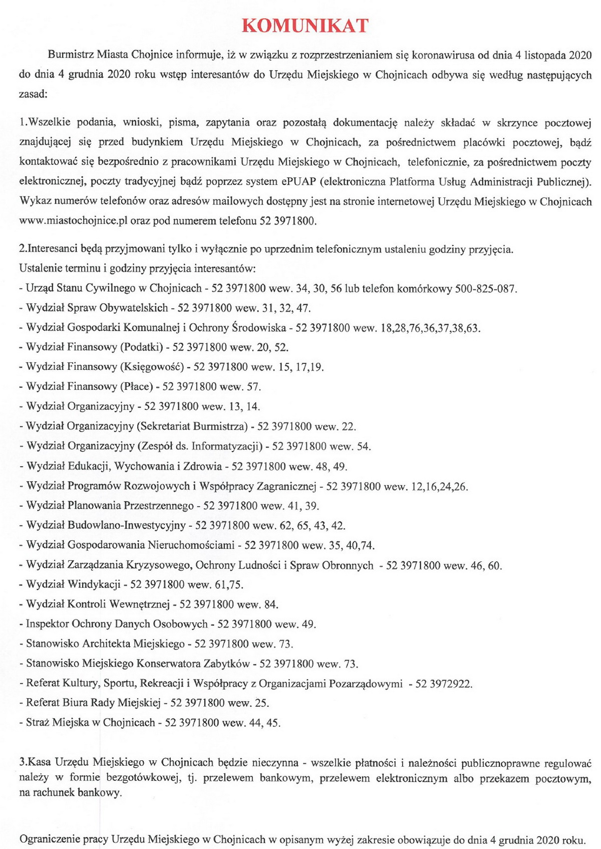 Burmistrz Miasta Chojnice informuje, iż w związku z rozprzestrzenianiem się koronawirusa od dnia 4 listopada wstęp interesantów do Urzędu Miejskiego w Chojnicach będzie odbywa się według następujących zasad.