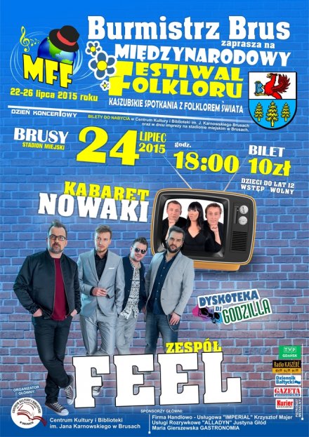 24 lipca w Brusach dzień koncertowy Międzynarodowego Festiwalu Folkloru. Wieczorem o godz. 18.00 odbędzie się koncert zespołu Feel oraz występ kabaretu Nowaki. Szczegóły na plakacie: