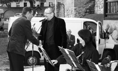 Wojciech Pietrzak (w środku) przyjmuje życzenia od burmistrza podczas koncertu w fosie miejskiej. | fot. arch.
