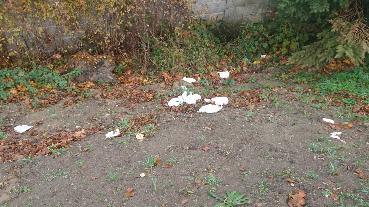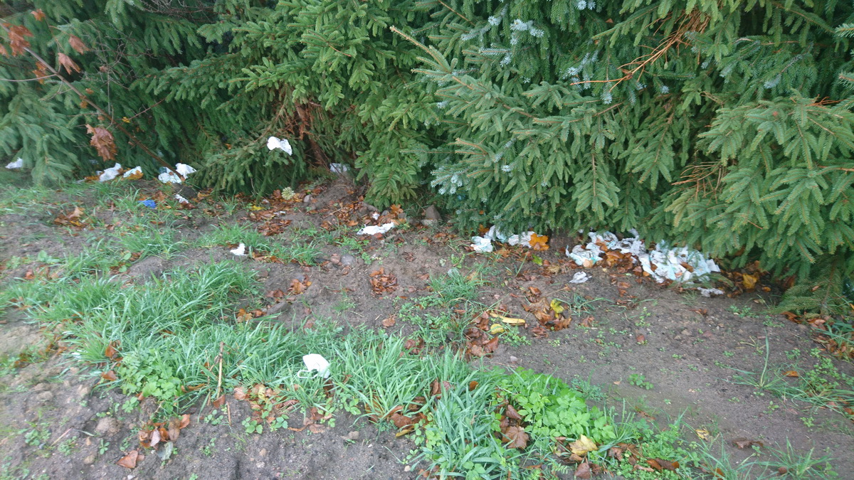 Okazało się, że nieznany sprawca wyrzucił je za skarpą biegnącą w dół pod rządkiem drzewek, które rosną po prawej stronie, jak wjedzie się na parking z ulicy Szkolnej. Były wśród tzw. pampersów także maseczki jednorazowe. Jedną sztukę pampersa zlokalizowaliśmy także na parkingu.